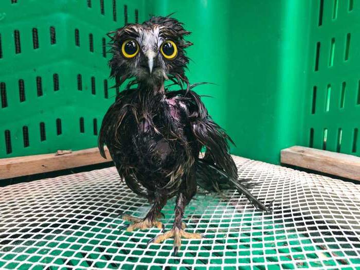 ▼貓頭鷹羽毛蓬鬆時,看起來非常莊嚴。當牠們浸泡在水裡,全身的羽毛都弄濕後,變成扁塌的狀態,就會變得非常好笑。這隻貓頭鷹淋濕後露出皮包骨的真身,特別是兩顆圓溜溜、閃亮亮的大眼睛,看起來更加明顯,跟洗澡之前的模樣簡直判若兩「鳥」。